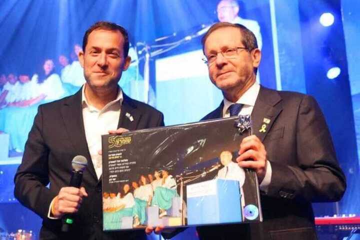 На фото: Президент Герцог на праздновании 50-летия поселенческого движения в Самарии получает от Йоси Дагана фотографию своего отца, президента Хаима Герцога, сделанную на праздновании 10-летия поселенческого движения в Самарии 40 лет назад.